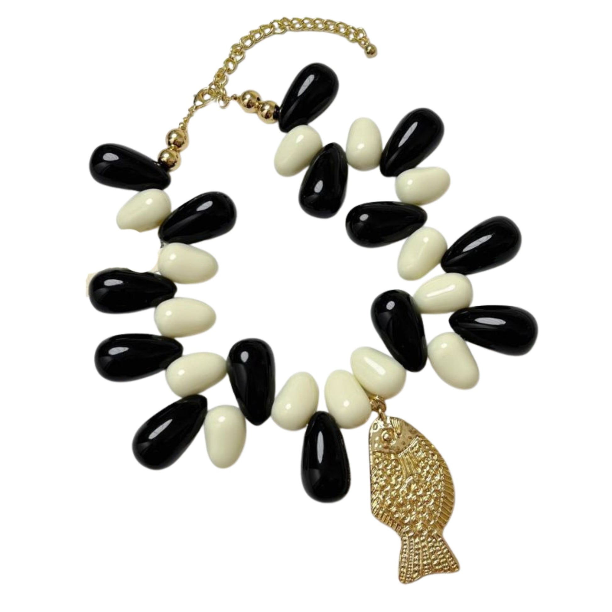 Collar statement de cuentas de resina en color blanco y negro, con dije de pez en aleación.