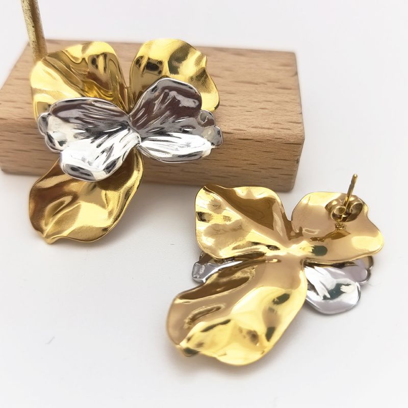 Aretes en forma de pétalos en acero inoxidable bicolor dorado y plata.