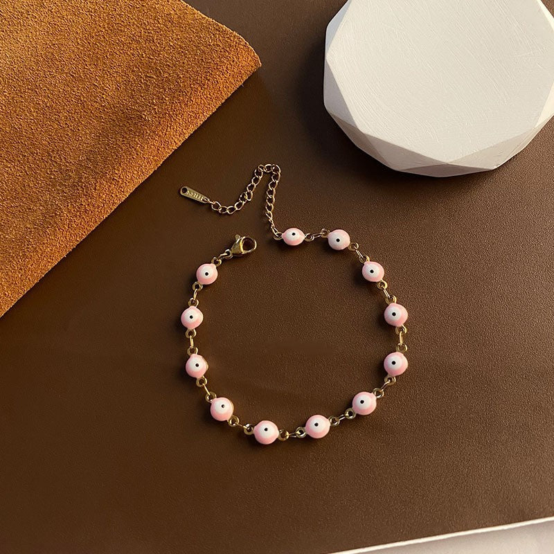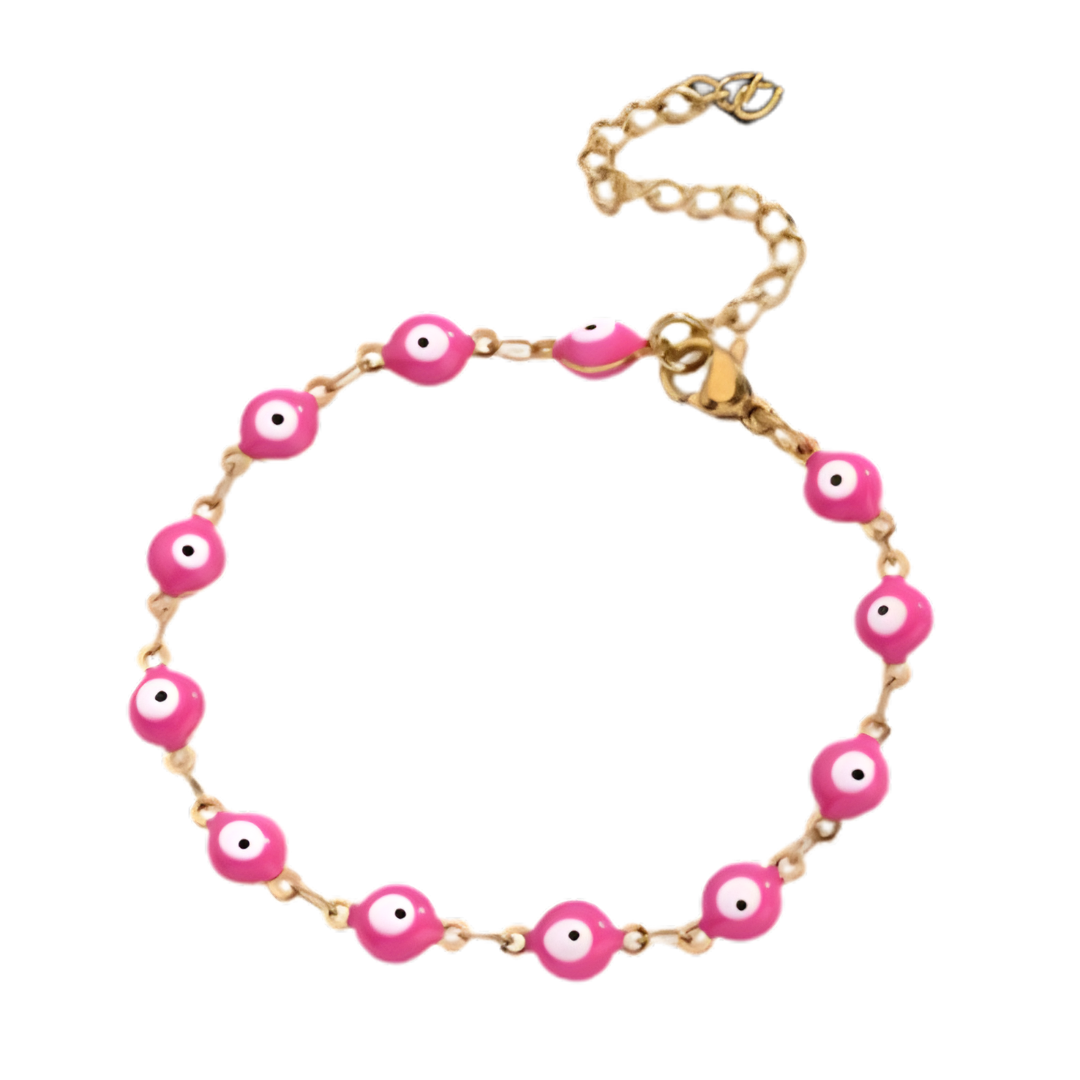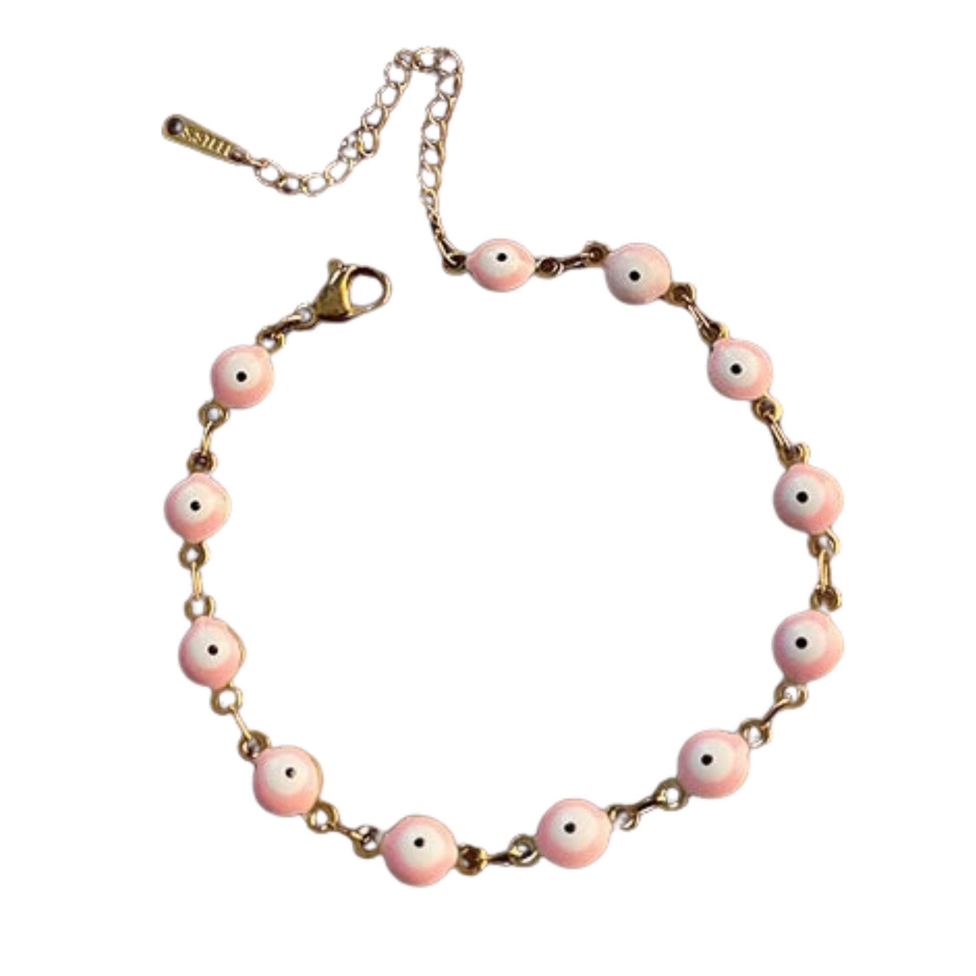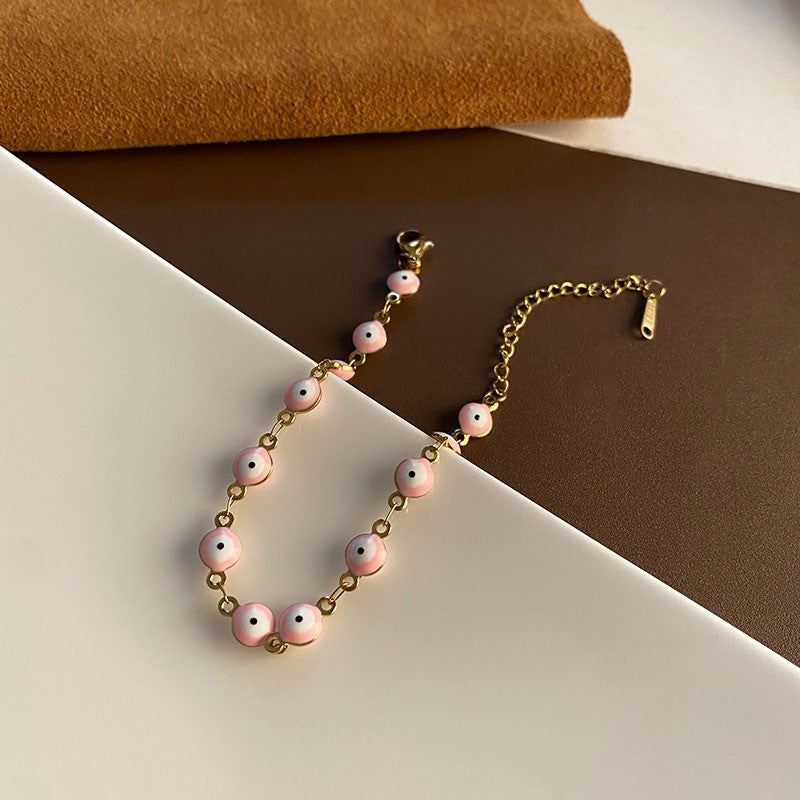 Pulsera de acero inoxidable con dijes de ojo color rosa.